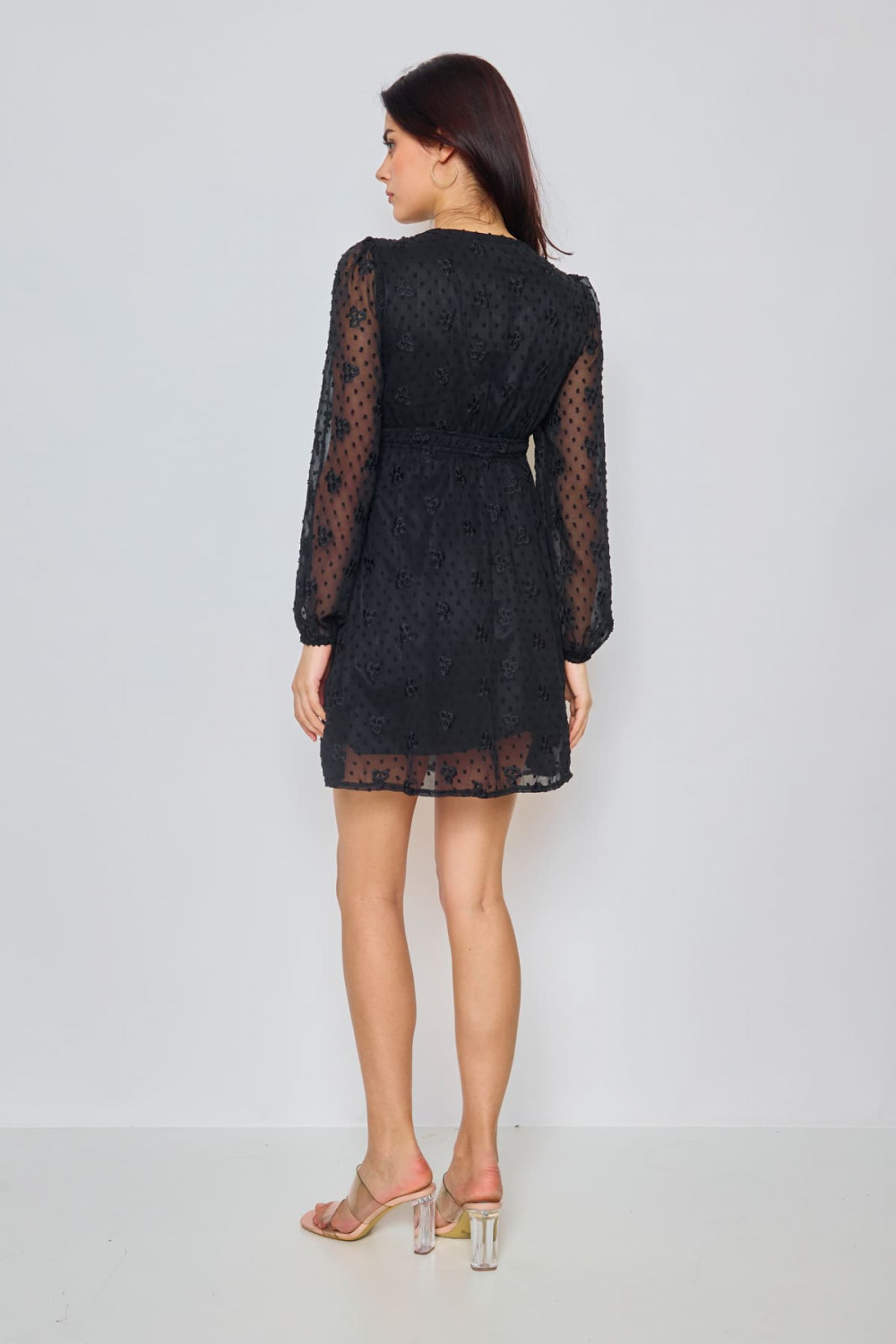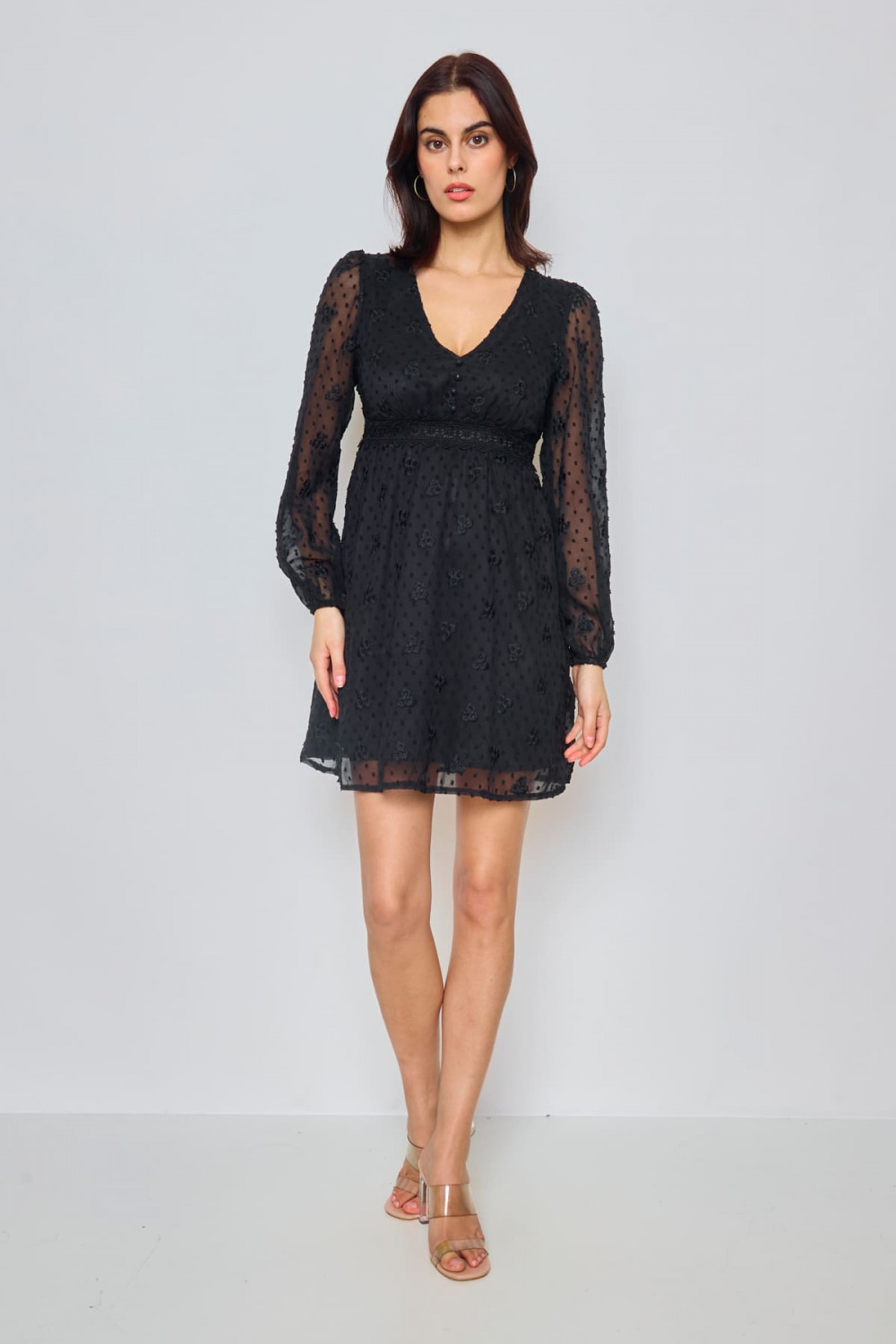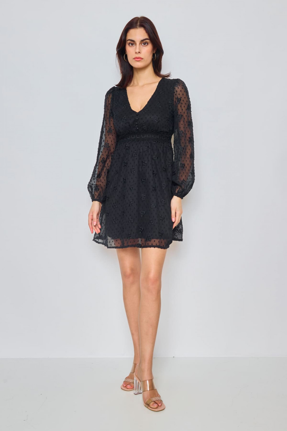LOVIE, Robe courte texturée, Doublée, Unicolore, Manches longues transparentes, Dentelle au niveau de la taille, Col V, Boutons décoratifs à l'avant, Doux, Fluide, Coupe ample, Poignets élastiqués, Longueur (taille S) : 87 cm